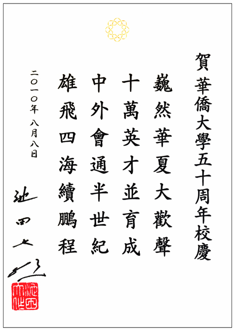 日本创价学会名誉会长、国际创价学会会长,华侨大学名誉教授池田大作日前为我校五十周年校庆题词:巍然华夏大欢声,十万英才并育成。中外会通半世纪,雄飞四海续鹏程。
