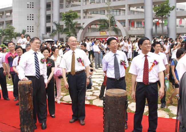 揭牌仪式后,领导和来宾们在厦门校区白鹭湖岸边观赏了龙舟竞渡表演,随后参观了训练基地和训练设施。赵阳副主任和丘进校长分别为崭新的龙舟点睛,画上了“醒龙之笔”。