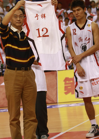 于祥突破千分光荣退役,大篮协执行主席张宁飞向于祥(右)赠送纪念T恤。