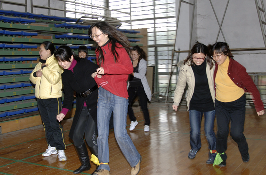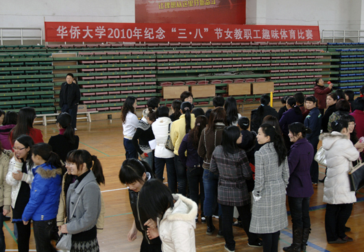 16个人,每两人一组,一条布条在各自踝关节处把两人靠近的腿紧紧绑住,形成两人三足,持棒起跑,绕过标志杆后返回,将棒交给下一组……这是昨日下午在泉州校区李回咤体育馆举行的纪念 “三八”妇女节女教职工两人三足接力赛活动。大家尽管跌跌撞撞,但仍然奋勇争先,其形其状,引得围观者哈哈大笑,其乐无穷。