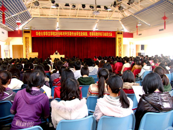 3 月 11 日下午,华文学院召开 2010 年对外汉语专业学生赴泰国、菲律宾教学实习动员大会。华文学院院长孙汝建、党总支书记兼副院长赵明光等院领导,学院办公室、教学办、培训部、招生办、学生办等部门领导,以及教学实习的带队老师和 07 、 08 、 09 级对外汉语专业的 353 名同学参加大会。华文系主任胡培安主持大会。