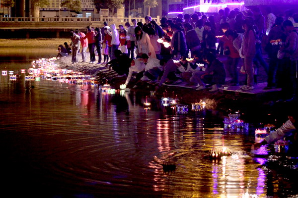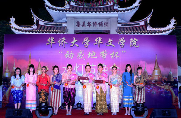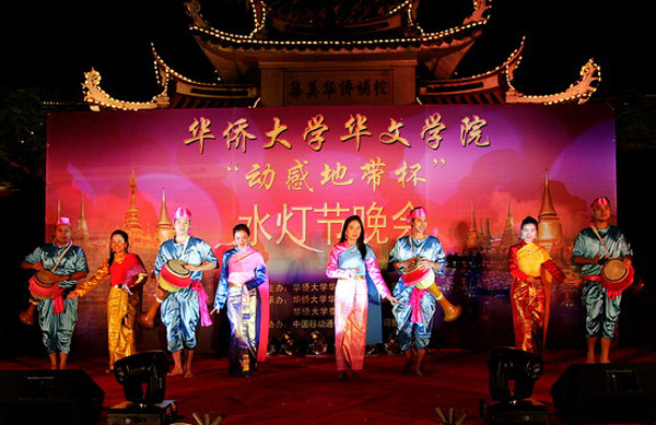 我校华文学院泰国水灯节晚会昨晚在学院南门广场拉开帷幕,泰国驻厦门总领事馆总领事哲萨搭·差湾帕克、泰国驻厦商务处领事金简妍,菲律宾驻厦门总领事馆总领事何瑞良夫妇,泰国航空公司厦门办事处总经理林金龙以及华文学院院领导赵明光、陈旋波、张灯、李晓洁等与各国留学生一同观看了晚会并放逐水灯,共同欢度这一年一度的泰国传统节日。