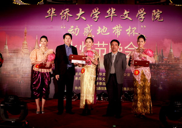 泰国驻厦门总领事哲萨搭·差湾帕克(左二)和华文学院副院长陈旋波为水灯小姐颁奖