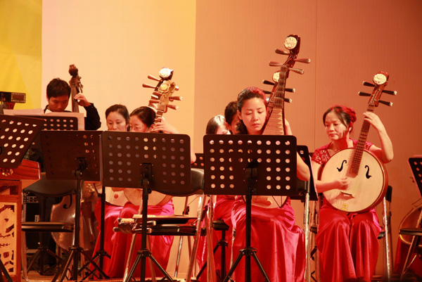 晚上 7 : 30 ,随着《碧湖春晓》轻快欢庆的节奏,音乐会拉开了序幕。精彩的节目接连上演,古筝独奏曲《建昌月》具有浓厚的民族特色,二胡齐奏《战马奔腾》气势磅礴,独特的演绎加之高昂的曲调,赢得观众的热烈掌声。随后,乐团还为大家送上曲调幽雅的扬琴独奏、笛子独奏,还有整齐悦耳的弓弦乐小合奏和弹拨小合奏。最后,音乐会在民乐合奏《金蛇狂舞》中圆满结束。