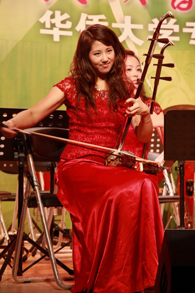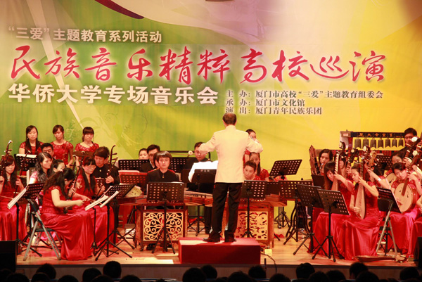 10 月23 日晚上,华侨大学王源兴国际会议中心二楼,乐声悠扬,气氛热烈。由厦门市高校“三爱”主题教育组委会主办,厦门市文化馆承办,厦门青年民族乐团出演的“民族音乐精粹高校巡演”在此举行。