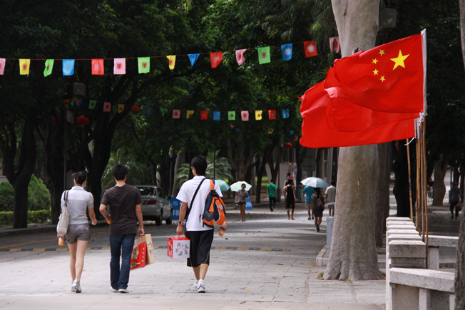 国旗飘起来,红灯笼挂起来,彩旗舞起来,国庆的华大校园,充满着喜庆氛围