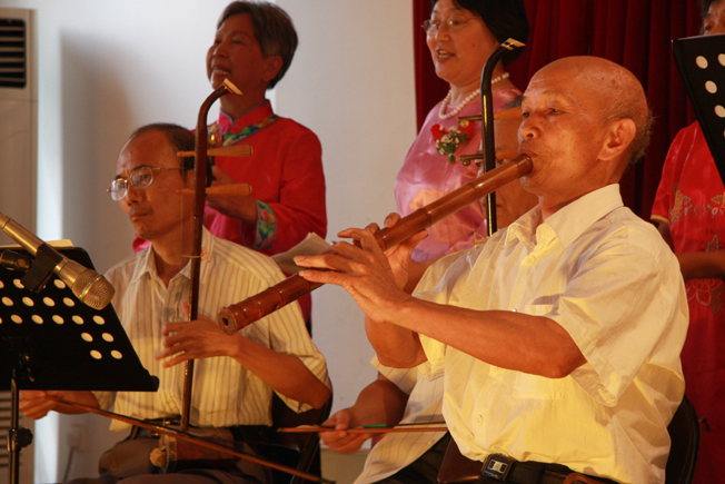 精彩的文艺表演、惟妙惟肖的书画作品、精致小巧的手工艺品……今日上午,在老年活动中心,我校老年大学的老同志们通过展示自己丰硕的教学成果,庆祝老年大学建校十周年。 文艺汇演上,老年大学的合唱团、南音社、民族舞班、民乐队等纷纷亮出自己的拿手好戏,献演了《今天是你的生日,中国》、《将进酒》、《功夫扇》、《健身球操》、《线条舞》等精彩文艺节目,手工艺班老同志用自己制作的精美手工艺品将舞台打扮地靓丽多姿,书画班老同志则举办书画展,展出自己的得意书画作品来汇报自己的学习成果。