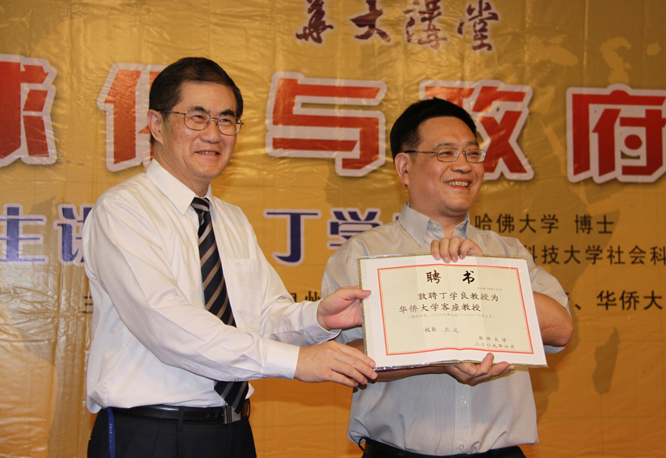 香港科技大学社会学部终身教授丁学良昨日受聘华大客座教授,华侨大学校长丘进在陈嘉庚纪念堂科学厅为其颁发聘书。