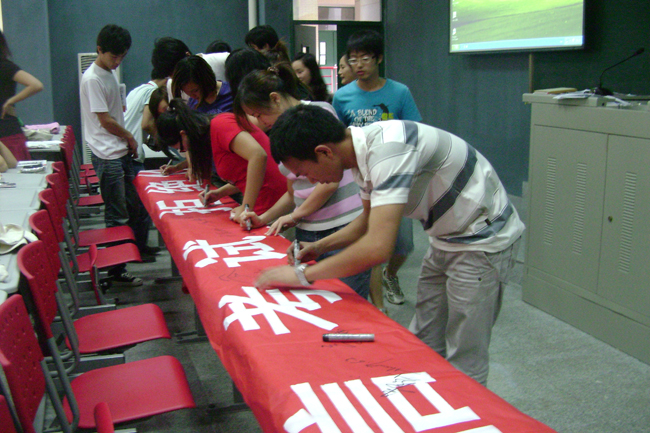 宣读《倡议书》后,同学们纷纷用笔在“ 诚信考试,拒绝作弊 ”的条幅上郑重地签上自己的名字,表达他们诚信应考的决心。音乐舞蹈学院还把签名的条幅悬挂在学院门厅中,以便能时时提醒和激励同学们要提高温书效率、积极诚信迎考。