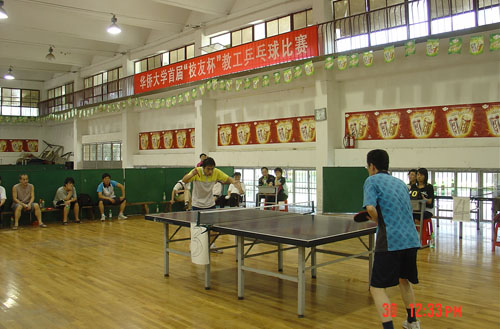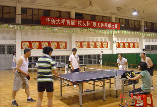 为活跃校园文化体育生活,推动我校教工乒乓球运动的广泛开展,由 93 级旅游系校友薛松生和健力宝公司友情赞助、校教工乒协和体育学院主办的华侨大学首届“校友杯”教工乒乓球单项比赛于5 月 29-30 日举行。副校长刘塨参加比赛。