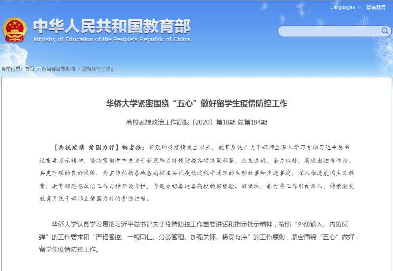 教育部高效思想政治工作简报刊登我校留学生疫情防控工作