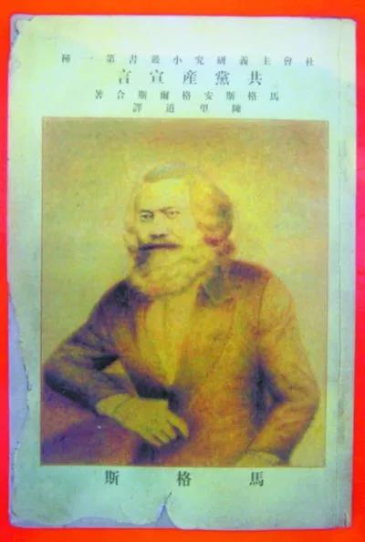 1920年8月,陈望道翻译的《共产党宣言》最早中译本在上海问世。它竖排平装,略小于32开本,全书共56页,用5号铅字排印;封面为浅红色,有马克思半身坐像,印着“马格斯(按即马克思)安格尔斯(按即恩格斯)合著”“陈望道译”“社会主义研究小丛书第一种”字样。