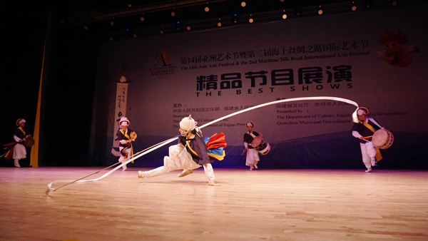 11月10日晚,第十四届亚洲艺术节暨第二届海上丝绸之路国际艺术节精品节目展演在我校陈嘉庚纪念堂观众厅举行。陈嘉庚纪念堂观众厅改造后首次亮相,即迎来了韩国的U-SO传统打击乐团、姜善英舞蹈团和越南的新活力竹乐团三支享誉亚洲的顶尖传统艺术团队,精彩演绎他们的民族文化与绝伦技艺。