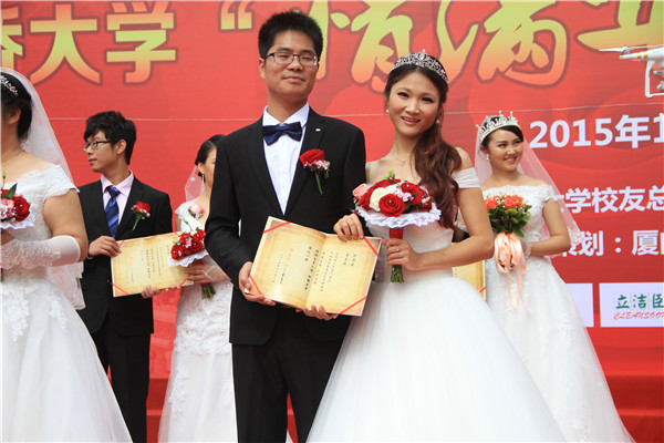 2006级校友汤钦洪与爱人李小丽是“80裸婚夫妇”。汤钦洪说:“我们认识不久就去领证了,属于先斩后奏的那种!今天我们回母校补办一个婚礼,也算弥补了一个遗憾吧。”提起集体婚礼,新娘李小丽说,“集体婚礼可以和大家一起分享自己的幸福和喜悦,比那种追求排场的婚礼更有意义。”
