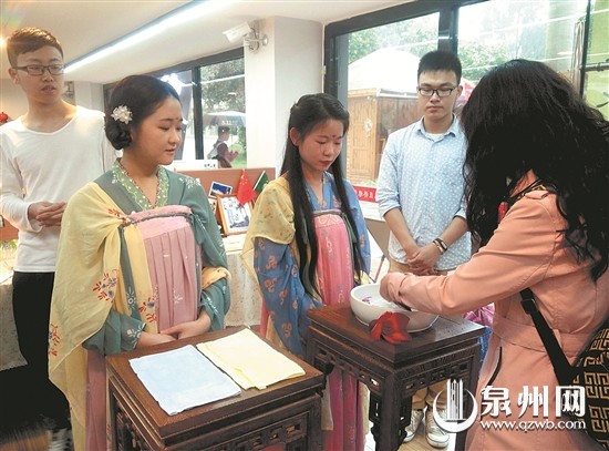 蒹葭汉服社社长李菲告诉记者,“绳结成双”就是青年男女对于自己心仪的对象,可以互系五彩绳相互认识对方。王羲之曾在《兰亭集序》中描述过“曲水流觞”,华大的学生则以茶代酒,以击鼓传花的方式来再现这一场景。
