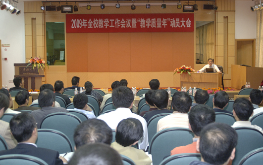 深入学习实践科学发展观,以“发挥综合优势,突出侨校特色,提高办学水平,建设知名大学”为主题,以教学质量年为抓手,狠抓优良教风、学风和管理作风建设,促进我校教学水平的全面提升。这是18日上午召开的华侨大学 2009 年教学工作会议提出的。 会议在陈嘉庚纪念堂科学厅举行,刘斌副校长主持会议。校长丘进,党委副书记、纪委书记朱琦环,副校长吴季怀、张禹东出席会议。全体中层干部、高级职称人员、教研室主任、各民主党派群众团体负责人等参加会议。 吴季怀副校长在会上作《深入学习实践科学发展观 加强教风学风建设 提升教育教学水平》的主题报告。他指出,深入学习实践科学发展观,就要求我们立足基本校情,坚持科学发展、内涵发展、特色发展;坚持教育以育人为本,以学生为主体,办学以人才为本,以教师为主体;坚持规模、质量、结构和效益的全面协调可持续,向着“规模适当、结构优化、质量至上、效益优先”的方面不断推进;同时遵循教育规律,统筹兼顾,协调各方。 在主题报告中,吴季怀详细论述了教学建设、学风建设和管理服务作风建设的重要性,指出了其中存在的主要问题,并重点阐述了应对之策。 关于教风建设,吴季怀强调,坚持教学工作的中心地位是教风建设的基本点;加强教师的师德建设是教风建设的关键点;强化师资队伍建设是教风建设的切入点;完善管理制度建设是加强教风建设的突破点。 如何加强学风建设,吴季怀提出,应当以教育树学风,以教风促学风,以纪律正学风,以管理建学风,以氛围育学风。而加强管理服务作风建设,则要求教学管理人员加强学习,提高素质;改进工作作风,增强服务意识;坚持严格管理、民主管理和科学管理,提高管理水平。 校长丘进作重要讲话。他针对国际流行的影响大学教学质量的几大因素,结合学校实际,就本次会议和“教学质量年”活动提出了自己的思考。他强调,教学质量是一个全校性的系统工程、长期工程,还是一个全民的工程,需要全校师生员工的广泛参与。全校师生员工都要围绕教学工作出主意想办法,积极主动地做好教学管理、教学保障、教学服务。 会上,土木学院副院长曾志兴、人文学院副院长王丽霞、文学院副院长徐华和学生处处长陈国柱分别发言,就如何提高教学质量、推进教风学风建设谈了各自学院的做法、认识和体会。 据了解,本次教学工作会议也是华侨大学“教学质量年”活动的动员大会。  丘进校长作重要讲话