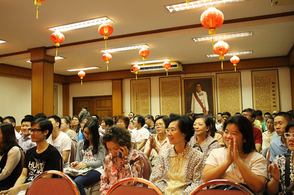 当日下午,汉语教师志愿者柯培勇在《但愿人长久》优美的旋律中开始中秋节的讲座。他结合幻灯片向在场师生介绍中秋节的起源。在中国的农历里,一年分为春、夏、秋、冬四季,每季又分为孟、仲、季三个部分,因而中秋称作“仲秋”。“仲秋”的月亮比其他月份的满月更圆更明亮,故又称“月夕”、“八月节”。人们借此寄托自己对故乡和亲人的思念之情。随后,柯培勇以广东潮汕地区为重点向大家讲述各地风俗,“拜月娘”“剥芋头”“烧蚁窟”等中秋节传统活动展现眼前,当然也包括中秋节必备习俗之吃月饼。俗话说“八月十五正月圆,中秋月饼甜又香”,月饼除了是中国人月下团圆时的桌上佳肴,也是中秋时节亲朋好友间联络感情的重要礼物。近年来,月饼热售于泰国各大商场,口味多样,深受各国人们喜爱。