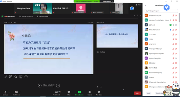 本次讲座设上午《书籍的翻译方法》、下午《汉语课堂教学实践》两场专题讲座,分别由泰国翻译家、作家萧亮金(Mr. AMORNTHEP SAESIEO),华侨大学高惠敏副教授担任主讲嘉宾。讲座主场设在泰国农业大学人文学院一号楼105会议室,采用Zoom线上直播的方式进行,参加讲座的线上注册学员超过300人,包括当地汉语教师、中文系硕士、博士学生以及从事汉语教学相关工作的人员。