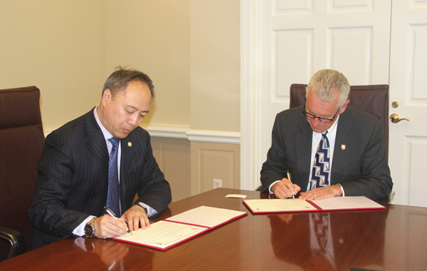 在美国鲍尔州立大学,该校校长Terry King、副校长Robert Morris、Marilyn Buck等接待代表团。曾路与Terry King签署两校合作备忘录,为进一步加强双方今后的合作奠定坚实基础。座谈中,Marilyn Buck对双方在学生交流、教师互访、师资培训等方面的合作前景充满信心。曾路表示,双方已有较好的合作基础,期待今后双方能携手进一步开创合作新局面。
