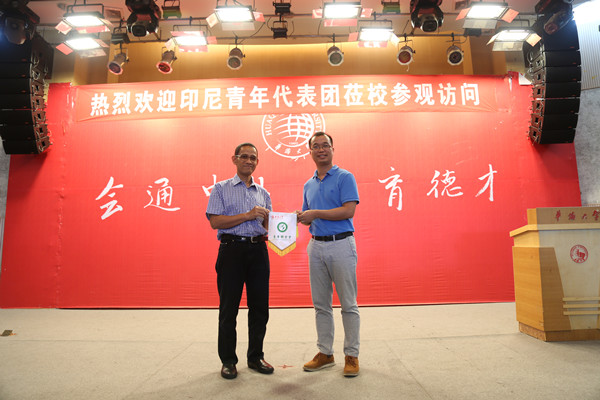 华侨大学青年联会会主席李庭志向印尼青年代表图赠送旗帜