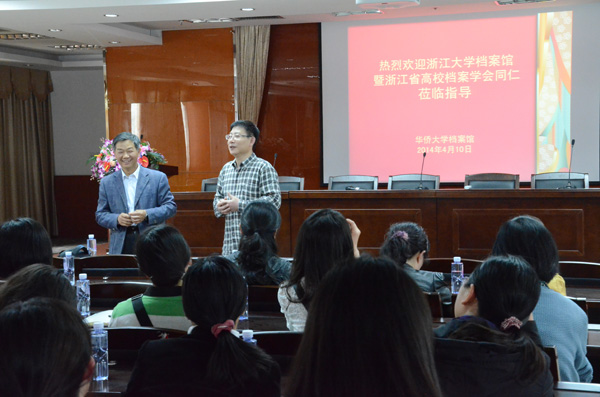 4月10日下午,浙江大学档案馆副馆长胡志富带领浙江大学档案馆及浙江省高校档案专业委员会部分成员一行40人来我校厦门校区档案馆考察调研。 档案馆馆长卫红向考察团介绍了我校档案馆的历史沿革、管理体制、馆藏、库房建设、文化建设、档案编研、档案数字化等情况,带领客人参观了实物档案陈列室和档案库房。客人们对客厅里正在举办的华大记忆(三)照片展及实物档案展览饶有兴致。我校档案馆员工与客人还就二级档案分室管理、兼职档案员培训与管理、机构设置等问题进行了交流。 浙江大学档案馆成立于1989年1月,与校史馆、博物馆合署办公。全馆编制为27人,设有收集指导办公室、保管利用办公室、特种档案办公室、信息开发办公室、编研展览办公室、校史研究室、干部人事档案室和综合办公室8个科室。