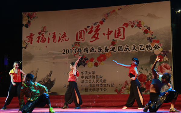 9月25日晚,由华侨大学、中共清流县委、清流县人民政府共同主办的“幸福清流 圆梦中国”2013年清流县喜迎国庆文艺晚会在清流县九龙广场举行。 晚会节目种类多样,民族舞、芭蕾舞、民歌、街舞、魔术等轮番上阵。开场歌舞《大中国》用充满动感的旋律表达对祖国生日的祝福。华大境外生们表演的《年的传说》,将中国传统武术与舞狮相结合。在《清流》的演出中,演员们用道具模拟出清流的竹林,表现清流县翠竹环绕的自然生态环境,再现清流人民热爱自然、与之和谐相处的景象。 福建省政协副主席陈绍军,三明市副市长纪熙全,福建省政协教科文卫体委员会副主任刘耀明,福建省林业厅纪检组组长黄文书,福建省农科院副院长余文权,福建省发改委能源处副处长林建安,中共清流县委书记梁奕章、县长冯明生、县人大常委会主任许天赠、县政协主席李增祥,华侨大学学生处处长陈国柱等到场观看演出。