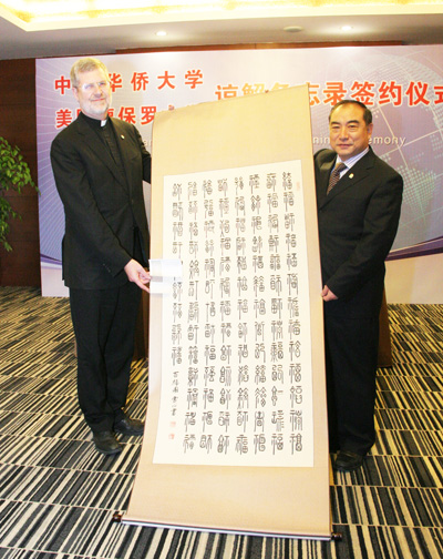 华侨大学与美国德保罗大学签署合作备忘录,华侨大学校长贾益民、德保罗大学校长富兰克林·霍尔茨施耐德分别代表双方在备忘录上签字。