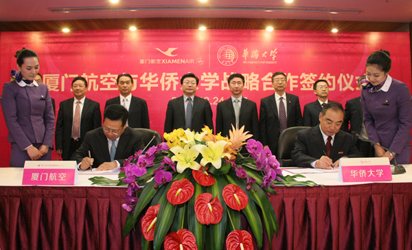 12月24日,华侨大学与厦门航空在金雁酒店签订战略合作协议,合作成立华侨大学厦航学院,开展人才培养、技术研发、战略发展等方面的合作事宜,力图通过发挥双方各自优势,促进民航事业的整体发展。 国务院侨办副主任马儒沛,文化司司长雷振刚;华大校长贾益民、党委书记李冀闽,副校长徐西鹏、刘塨;厦门航空董事长车尚轮,党委书记张群治,副书记牟建勇,副总经理蔡城堡等出席签约仪式。 贾益民和车尚轮分别代表双方在协议书上签字。 李冀闽和张群治分别致辞。李冀闽表示,开展产学研合作、服务地方经济和国家战略需求,是高等学校的重要职责和任务,是促进高校自主创新、培养创新人才的重要举措,也是高校落实科学发展观,实现健康、协调、可持续发展的内在要求。此次签订战略合作协议,为双方提供了极为重要的发展良机,希望双方通过资源共享、优势互补,开展广泛而密切的合作,实现互惠共赢、共同繁荣,携手为海峡西岸经济区发展建设做出新贡献。 张群治称,华侨大学和厦门航空在以人为本、重视培训、拓展国际化战略等诸多方面不谋而合,在人才培养、技术研发等方面还有许多“交集”及各自优势,因此双方战略合作有利于优势互补、形成共赢。双方建立战略合作关系,不仅有利于深化校企产学研合作机制,而且也是拓展校企合作模式的创新举措。 根据协议,双方将在“人才培养和教学”、“技术领域的科学研究”、“建立在校学生的实训、实习、实践基地”、“组建校企科技协同创新中心”等方面开展深度合作。