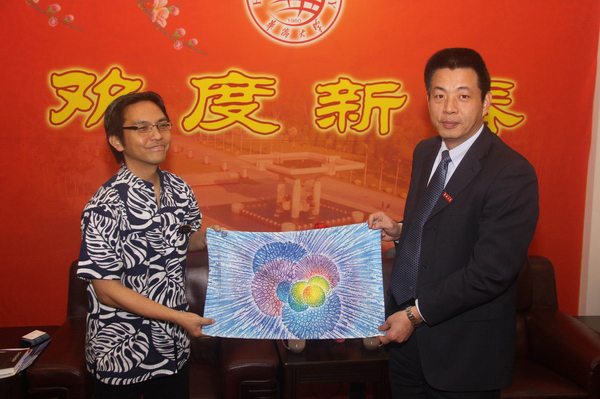 副校长吴季怀会见日本冲绳县文化观光体育部部长平田大一(左),图为双方互赠纪念品。