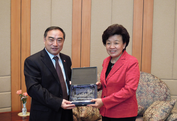 贾益民校长拜访香港中联办,图为与殷晓静副主任(右)互赠纪念品。 |