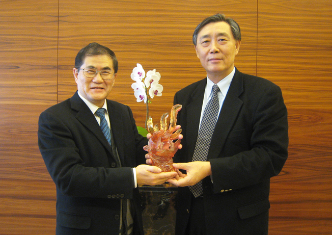 丘进校长与凤凰卫视常务行政副总裁崔强(右)互赠纪念品 |