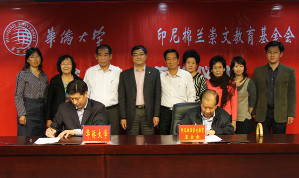 12月4日上午,张禹东副校长在厦门校区会见了印尼棉兰崇文教育基金会董事会主席黄两承先生一行,双方就师资培养及合作开展华文教育等事宜进行交流并签署合作协议。华文教育办公室主任赵明光及华教办全体成员参加会见。 在行政研发大楼801会议室,张禹东副校长认真听取了黄两承主席关于棉兰崇文教育基金会开展华文教育工作的介绍,他高度赞扬崇文教育基金会的办学理念及该会为推动印尼华教事业发展做出的重要贡献,并表示华大今后将进一步加强与崇文教育基金会的合作,为其开展华文教育工作提供一切力所能及的帮助。 黄两承主席首先感谢华侨大学长期以来对印尼师资班学员的悉心培养,提及他们从我校学成归国后已成为棉兰华文教育的中坚力量,同时希望崇文教育基金会正在筹建的“崇文三语中小学”能够得到华大的指导和协助。 会谈结束后,双方在厦门校区行政研发大楼401会议室签署合作协议。华大华文教育办公室主任赵明光、印尼棉兰崇文教育基金会董事会主席黄两承,分别代表双方签署协议。张禹东副校长与印尼棉兰崇文教育基金会访问团成员共同见证签约。 根据合作协议,双方将在提供奖学金、开展夏令营和师资培训以及外派教师等方面进一步加强合作,共同推动印尼苏北棉兰地区华文教育的发展。 棉兰崇文教育基金会成立于1955年,长期以来与华侨大学合作密切。2008年,基金会理事长苏用发先生率团访问我校,探讨重振棉兰华文教育,推广中华文化等各项合作事宜。基金会旗下的“崇文华文学苑”是目前棉兰最具规模、最规范的华文补习学校和汉语文化交流中心,由华侨大学文学院季素彩教授担任校长。目前正在建设的“崇文三语中小学”新校区将于2011年7月正式开始招生,学校占地2公顷,设有从幼儿园到中学多个年级,计划招生3000余人。