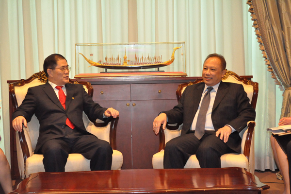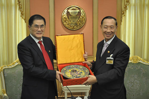 丘进校长与泰国上议院巴索素议长(右)互赠纪念品  丘进校长与泰国外交部提拉昆次长(右)亲切交谈 |