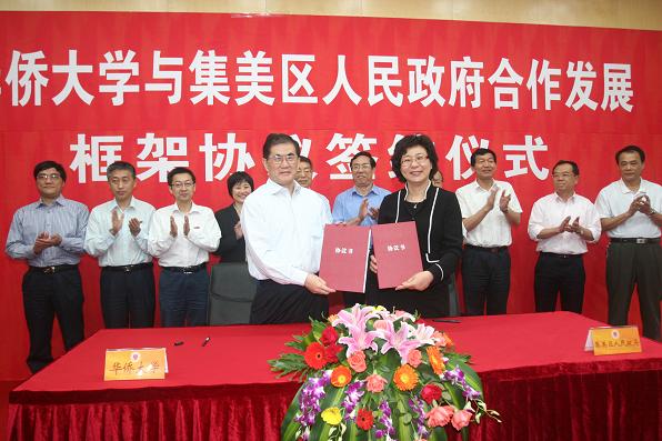 “华侨大学已被国家教育部和财政部正式列入国家特色项目建设的高校。华大将用好这一政策,高标准、严要求,立足集美、面向全国、走向世界;集美文教区将出现一所海内外知名的高水平大学,成为这个新兴现代化城区的教育高地、文化高地、科技高地和人才高地。” 这是华侨大学校长丘进在“华侨大学与集美区人民政府合作发展框架协议”签约仪式上充满信心的表达。 5月14日下午,丘进校长和厦门市集美区倪超区长,分别代表双方在王源兴国际会议中心二楼会议室签订“华侨大学与集美区人民政府合作发展框架协议”。此举,标志着双方的合作翻开新的一页:进入在更宽广的领域、更高层面上进行长久合作,以实现互利双赢、共同发展的新阶段。签字仪式由刘斌副校长主持。 集美区委书记黄锦坤,率领集美区委、区人大、区政府和区政协及集美区有关部门领导30余人出席签约仪式。 华侨大学党委书记李冀闽,党委副书记朱琦环,副校长徐西鹏、刘塨、张禹东出席签字仪式,并上台见证签约。校长助理彭霈、张云波、曾路,及学校有关部门领导出席签约仪式。刘塨副校长宣读协议文本。 根据协议,华大将充分发挥学科优势,鼓励和支持相关专业的博士、专家学者进驻集美相关博士后科研工作站、工程技术研究中心、企业技术中心等研发机构,结合集美区建设发展需要,积极开展应用性研究和开发性研究;积极承担区内有关科研课题;双方共同搭建产学研合作平台,在集美区成立技术孵化机构,形成产学研孵化机制。采取厂校、区校合作等形式,建设实验基地或中试基地,多形式、多渠道地开展科技应用与培训工作。 根据集美区的实际需求,华大为其党政机关工作人员、企业家和其他专业人员举办各种类型的继续教育和专题培训,尤其是法律硕士(JM)、工商管理硕士(MBA)、公共管理硕士(MPA)、工程硕士,以及即将开展的其他多种领域(如财务、税务、警务、旅游、城市规划等十余种专业硕士学位)的教育。与集美区共建教育平台,积极为集美区培养急需的各类高级专门人才。 集美区将重点支持华侨大学厦门校区的建设,将学校列入集美区高等教育发展规划;全力解决校区建设用地的征地、拆迁等工作,确保校区建设用地需要,使华侨大学如期完成校园建设的规划。集美区政府还将积极承接和安排华侨大学学生开展社会实践活动,并根据实际需要在相关单位设立“华侨大学学生社会实践基地”,为华侨大学学生社会实践活动提供各种便利。积极鼓励和引导区内重点企业到华侨大学举办各种人才招聘会,吸收优秀毕业生到集美区就业、创业。 丘进校长热情致辞欢迎各位嘉宾光临华大,衷心感谢集美区委区政府和集美人民,在华大建设过程中,将华大视为自己的大学,以最大的热诚支持新校区的建设,在征地拆迁、治理环境、改善交通、方便生活等方面,所给予学校的巨大帮助。并向来宾简要介绍华大发展概况和建校50年来为国家教育事业,为地方社会、经济建设,为港澳回归、稳定和繁荣,为祖国统一大业,为中国国际关系的不断改善做出的重要贡献。 丘进介绍了厦门校区建设缘起和进展情况。称在双方的努力下,华大开始融入集美,主动服务地方各项事业。几年来,华大已经同厦工、金鹭特种合金、日上钢圈等企业、单位签订了科研攻关、产品开发、设计规划、人才培养等各种合作项目近百个,并取得初步成效,显示高校在地方发展中的积极作用。 倪超区长在致辞中盛赞“华大校园风景如画,充满着勃勃生机,是陆续进入集美区诸多高校中的佼佼者;引进华大,给集美发展很大的带动”。相信通过签订协议,华大能够以突出的智力优势和人才优势来扶持地方,帮助集美经济和社会更快地发展;集美区也理应为华大发展创造更好的环境,全力帮助解决征地拆迁、周边环境治理和相关设施配套等问题,让华大校园更完整、环境更漂亮。 双方共同祈愿:一起努力,把华大建得更大,集美建得更美。 签约仪式前,出席仪式的校领导一起到厦门校区大门前迎候集美客人,并陪同来宾登临行政大楼26层俯瞰新校区全景,参观四端文物馆和厦门校区模型室。 据悉,为进一步发挥学校在为侨服务、为地方经济建设中的作用,2002年12月,国家决定建设华大厦门校区。2006年9月新校区正式启用。目前,厦门校区一期工程业已完成;二期工程正在开工建设,有9个学院在厦门校区成建制办学,学生规模逾万,高效有序的管理体制已经建立。