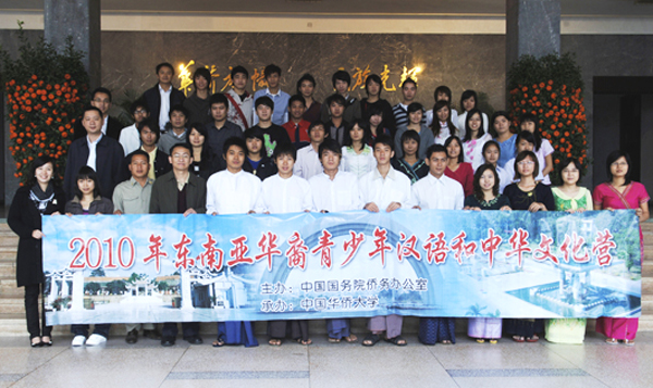 由国务院侨务办公室主办、华侨大学承办的2010年东南亚华裔青少年汉语和中华文化营,4月23日上午在陈嘉庚纪念堂二楼会议室举行开营式。 华侨大学招生处吴春安处长代表主办方致开营辞,向来校参加文化营活动的华裔师生表示欢迎,希望营员们在学习考察期间用心学习和体会华侨大学安排的中华文化主题系列课程和实践活动,并为今后来华深造打下良好基础。 缅甸曼德勒福庆学校代表林翠老师、老挝乌多姆赛中老侨联学校许顺宏校长分别代表前来参加文化营的师生致词,对主办单位中国国务院侨办和承办单位华侨大学为此次活动的精心安排表示衷心的感谢,并寄语参加此次学习营的同学们通过10天的学习交流,感受璀璨的中华文化和丰富多彩的大学校园文化生活。 随后,双方互赠纪念品,东南亚五国的华裔青少年还观看了华侨大学宣传片并合影留念。开营式结束后,营员们在华侨大学“青春使者”志愿导游队导游的带领下参观了校园风光。 此次文化营活动共有来自缅甸、越南、老挝、泰国和印尼的45名东南亚华裔青少年参加。华侨大学为文化营安排了传统美术、民族音乐、民族舞蹈、心理学及学生活动介绍等主题课程,结合以游览泉州、厦门名胜古迹等户外实践活动。4月24日上午,文化营的师生还将参加由我校东南亚留学生举办的泼水节,共同为我校师生带来东南亚国家新年的祝福。 本次东南亚华裔青少年汉语和中华文化营的成功举办还得到了昆明华文学校及广西华侨学校的大力支持与配合。