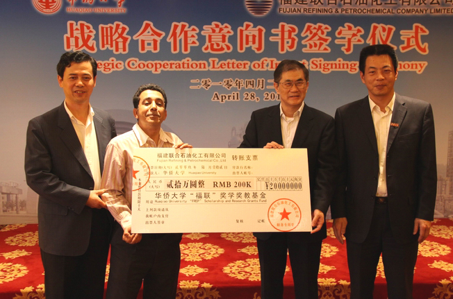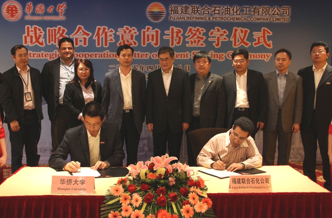 高校与企业合作是促进现代社会经济发展的原动力,能使双方的优势和资源得到最佳互补、配置和共享。28 日,华侨大学与福建联合石化公司签署战略合作意向书,此举标志着华侨大学在与地方企业的合作上又积极跨出了重要一步。 当日上午,我校校长丘进、副校长吴季怀,校长助理彭霈、张云波、曾路及相关单位负责人一行 10 余人前往位于泉州市泉港区的福建联合石化公司,与公司董事长陆东,副总裁苏比翼等相关部门负责人座谈,双方表达了良好的合作意向。 丘进说,世界上一流大学都和世界知名企业结成密切的关系,他希望此次华大与福建联合石化的合作能够在福建省起到一个好的示范作用。希望今后能得到福建联合石化对我校人才培养、科学技术、社会服务等方面更直接的帮助,学校也将尽全力为福建联合石化提供化工学科上的支持,并盛情邀请对方参加我校五十周年校庆庆典活动。 陆东感谢华侨大学为联合石化培养输送了一批批骨干人才,他表示,此次很荣幸与华侨大学建立合作关系。校企合作是双赢的,华侨大学在化工领域拥有很强的实力,能够给企业带来很多技术方面的帮助,企业也能提供将学校科研转换成生产应用的途径。陆东希望此次签约为双方今后在更多领域上的合作打开方便之门。 吴季怀副校长与苏比翼副总裁在战略合作意向书上签字,苏比翼先生还向华侨大学捐赠二十万元人民币作为“福联”奖学奖教基金。随后,丘进校长一行在陆东董事长的陪同下参观联合石化公司生产基地。 据悉,去年 10 月份,华侨大学曾与泉港区政府签订合作发展框架协议,内容涉及校企合作等八个方面。此次签署战略合作意向书表明双方在合作发展框架协议的基础上进入了实质性合作的阶段。 福建联合石化是由福建炼油化工有限公司、埃克森美孚中国石油化工公司和沙特阿美中国有限公司共同设立的中外合资大型石油化工企业,于 2007 年 3 月成立,旨在建设和运营世界级、高科技、一体化的石油化工基地,现炼油量每年 1200 万吨。  华侨大学校长丘进与福建联合石化公司董事长陆东(右)座谈