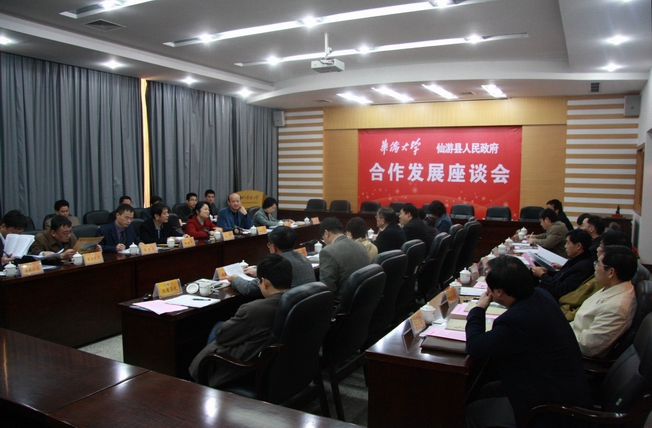 今天上午,校长丘进在陈嘉庚纪念堂会议室接见仙游县县长林桦一行,双方就校地合作事宜进行座谈。校党委副书记、纪委书记朱琦环,校长助理彭霈,我校部分单位、学院负责人及仙游县政府相关部门负责人出席座谈会。 丘进欢迎林桦县长的来访,并向来宾介绍了我校概况,办学规模及校地合作情况。他说,地方的发展,教育是捷径,也是长久之计。华侨大学与仙游县的合作有紧迫性、必要性和创新性。华大很乐意同仙游县合作,将为仙游县政府提供丰富的学科教学资源,并对仙游县在职人员的进修提供帮助。他希望华大与仙游县的合作对校地合作起着示范性效果。 林桦县长表示非常高兴能与华大进行合作,她说,仙游县虽然发展相对滞后,但具有非常明显的区位优势。她希望能与华侨大学建立长期、稳定的合作关系,借助华大的学科优势,有效整合科技资源,优势互补,实现校地共同发展。 随后,与会双方就合作意向进行自由发言,合作的内容涉及旅游发展、材料化工、建筑规划、区域发展、工艺美术、工商管理等学科领域,合作的形式包括建立研发实训基地、项目攻关与对接转化、人才培训讲座、研究生挂职、学生就业创业等。 据悉,我校将充分利用学术、技术、信息和人才等方面的优势,积极为仙游县提供各种科技信息及可转化为现实生产力的科技成果,在城市规划与建设、资源与环境、旅游规划与开发、产业资源综合利用,产业创新与技术开发、人才培养与交流等方面和仙游县政府开展深层次、宽领域、高水平合作与交流。  丘进校长与林桦县长(左)互赠纪念品