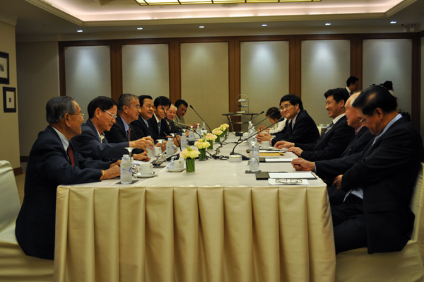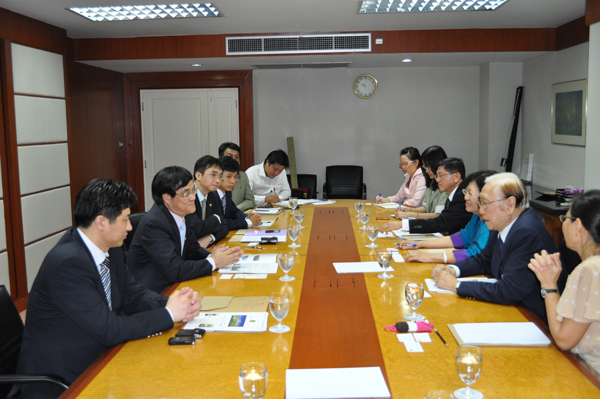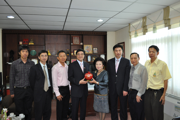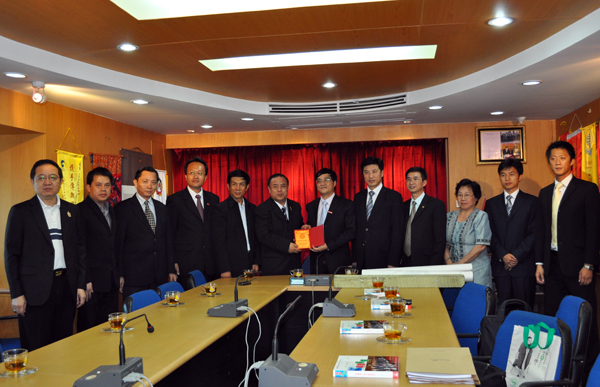 为进一步推进我校在泰国的华文教育拓展工作,在泰国访问的华侨大学华文教育工作代表团一行广泛接触泰国社会各界人士和社团,取得良好效果。14 日中午,代表团一行拜会了国家汉办驻泰代表庞丽,就我校在泰国孔子学院、孔子课堂、志愿者工作等事宜进行交流沟通。 15 日上午,代表团一行访问泰国博仁大学,受到名誉校长维萨坤、行政副校长缴吉丽亚女亲王、行政副校长助理丁钟贤等热情接待。双方就已开展的合作项目进行了回顾总结,深入探讨加强两校之间进一步开展合作的新形式,并就派团参加我校校庆庆典活动达成共识。中午,代表团访问了泰华青年商会,与李桂雄会长等进行会谈,争取该会对我校在泰开展华文教育的支持。下午,代表团与泰中经济文化协会举行会谈,威七将军主持会谈,双方就继续办好泰国官员中文学习班、组团参加校庆活动、丘进校长访泰活动安排等内容进行了友好交流。 16 日上午,代表团在我校泰国校友会副会长陈碧达、广东会馆前主席许永春陪同下,前往普吉市政府进行访问,受到普吉市市长、副市长的热烈欢迎,双方就在普吉开展夏令营活动以及与普吉地区所在高校和中学开展进一步合作等事宜进行了会谈。晚上,普吉市长许得意女士专门设宴招待代表团,并邀请皇家师范大学校长、普吉中学校长、普吉泰华中学校长等教育界人士作陪,在友好坦诚的气氛中,双方就深化合作形式、内容、推进措施等方面进行探讨,取得了良好效果。  与泰中经济文化协会会谈
