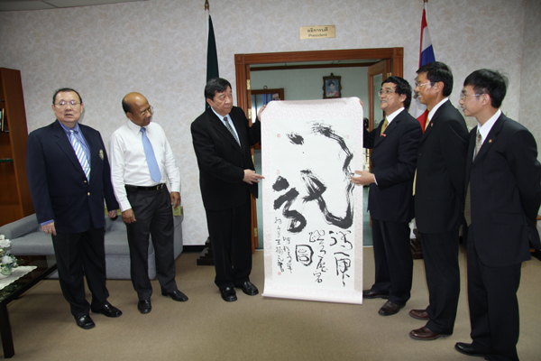 应泰国农业大学邀请,在泰国访问的华侨大学华文教育工作代表团 3 月 17 日对该校进行友好访问。代表团团长、副校长张禹东一行先后会见了泰国农业大学校长 Vudtechai 先生、国际事务副校长 Sornprach 先生,就孔子学院建设及两校合作中的其它问题进行交流和探讨。 张禹东副校长介绍了华侨大学近几年来对泰国政府官员进行汉语培训所取得的成效以及泰国诗琳通公主与华侨大学的渊源;他表示,华侨大学和泰国农业大学有各自独特的优势,双方可以通过孔子学院这一窗口和平台,加强在其它领域,特别是在语言、文化、教育领域的交流与合作。 张禹东副校长代表华侨大学邀请农业大学校领导在今年适当时机赴华侨大学出席农业大学孔子学院第二届理事会及华侨大学建校 50 周年校庆。 泰国农业大学校方对华侨大学代表团到访表示热烈欢迎,并希望通过共建孔子学院促进两校在更广泛领域进行合作。 访问期间,张禹东一行还参观、走访了农业大学图书总馆以及设在馆内以诗琳通公主命名的农业大学国际研发与技术转让中心,学生活动中心、网络中心、人文学院及孔子学院。  张禹东副校长(右三)向农业大学校长 Vudtechai 先生(左三)、国际事务副校长 Sornprach 先生(左二)赠送纪念品