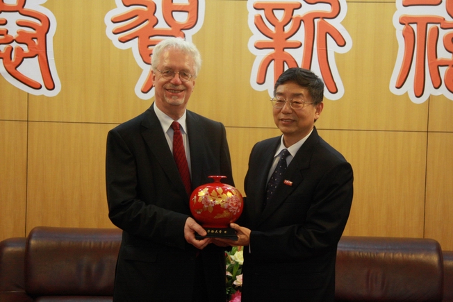 借参加“首届海峡两岸闽南文化节”之机,昨日下午,德国驻广州总领事舒涵德先生一行三人莅临我校参观访问。 丘进校长、李冀闽书记先后会见了舒涵德先生一行。 丘进校长向舒涵德先生介绍了华侨大学的发展现状,希冀借总领事此行,开启华侨大学与德国方面交流与合作的新局面。丘校长说,华侨大学是一所以理工科为优势的综合性大学,希望舒涵德先生能够帮助推荐相关的德国院校、科研机构或企业进行一系列的交流和合作,同时希望能够在德国引智方面得到舒涵德先生的支持。丘校长以个人名义向总领事赠送了一幅中国传统书法作品,热情欢迎舒涵德先生有机会到华侨大学厦门校区参观。 李冀闽书记代表华侨大学赠送瓷器予舒涵德先生,祝愿中德两国友好。李书记向客人简要介绍了华侨大学的发展历史、办学规模等基本情况。他说,希望通过领事馆,建立和促进华侨大学与德国高校的交流与合作,对中外文化交流和社会发展起到推动作用。 舒涵德先生对华侨大学的热情接待表示感谢。他简要介绍了德国高等教育的特点,并推荐了位于广州的德意志学术交流中心作为对德高校、科研院所开展交流合作的资料中心。舒涵德先生说,此次的来访是文化之旅,他本人也十分重视区内文化交流,希望见到更多中国学生到德国高校学习。他同时表示德国驻广州领事馆将不遗余力地为中德高校文化交流搭建桥梁。 随后,舒涵德先生在校长助理曾路及外事处等领导的陪同下参观了我校美术学院地下展厅及法学院模拟法庭等地。 据了解,这是舒涵德总领事自2008 年就任以来,首次访问泉州。  丘进校长会见舒涵德先生一行(图:陈旭峰)