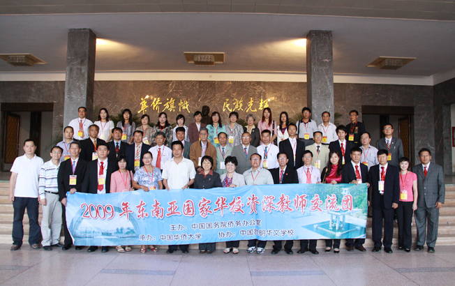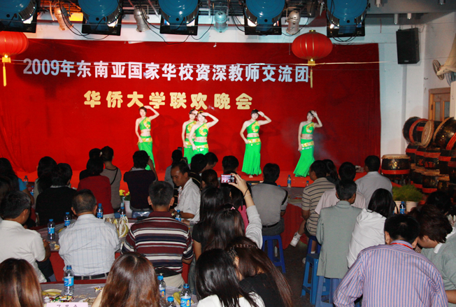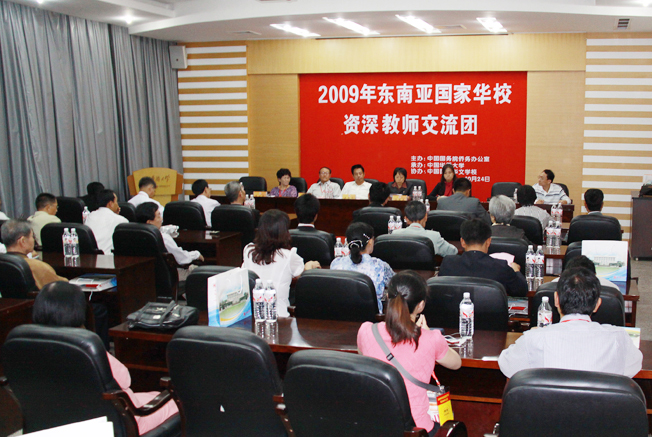 24 日,2009 年东南亚国家华校资深教师交流团一行42人到华侨大学访问。交流团成员是来自缅甸仰光、曼德勒、东枝、腊戌、密支那、南坎、大其力、九谷、木姐、瓦邦和泰国清迈、清莱等地区学校的教师和校董代表,以及来自缅甸大其力大华青年会、瓦邦勐波县教育局、泰国曼谷中华会馆、中国昆明华文学校、普洱民中和瑞丽侨联的代表。 此次活动由国务院侨务办公室文化司主办、华侨大学承办、昆明华文学校协办。活动为期一周,包括:与在华侨大学就读的东南亚留学生交流联欢,到学生餐厅就餐,体验华大学生生活, 游览泉州、漳州、厦门三地的风景名胜,参观华大泉州和厦门校区,听取三场专题讲座等。 国务院侨务办公室文化司副巡视员汤翠英,华侨大学副校长吴季怀出席在陈嘉庚纪念堂二楼会议室举行的欢迎仪式。 汤翠英女士代表国务院侨办文化司对交流团成员的到来表示欢迎,并汇报了文化司今后在华文教育方面着重开展的工作。她表示,支持和帮助海外华侨华人开展华文教育,促进华侨华人社会的和谐发展是国务院侨办义不容辞的责任。她称,中华文化是凝聚、支撑中华民族绵延发展的精神支柱,是全球华侨华人相拥相依的纽带。发展华文教育,不仅是中华民族语言文化在海外薪火传承的需要,更是增进海内外中华民族儿女凝聚力,提升中华民族整体形象和实力的需要。她希望大家团结起来,抓住机遇,共同推动海外华文教育的发展。 吴季怀副校长感谢国务院侨务办公室主办此次活动,并对不远万里来到中国的交流团成员表示欢迎,希望大家共同把华文教育事业做好、做大、做强。 交流团代表、缅甸曼德勒福庆学校副校长李兰芳女士表示,华侨大学是面向海外开展华文教育的主要基地,在缅甸知名度很高,是缅甸青少年向往的大学,多年来,华大始终坚持为侨服务的办学宗旨,为缅甸造福,缅甸的学生来此学习回国后,以优秀的传统文化为主导,推进素质教育,为缅甸培养了不计其数的人才。她祝愿中缅两国繁荣富强、友谊万古长青,祝海外华文教育事业明天更加灿烂辉煌。 交流团代表、泰国清莱美赛华侨公学校董高明中介绍了华侨公学华文教育开展情况,并祝愿中泰两国人民友谊源远流长。 25 日晚,在金川活动中心一楼展厅,交流团成员与在华大就读的东南亚留学生围坐在一起交流联欢,共同度过了一个欢乐的夜晚。  欢迎仪式现场
