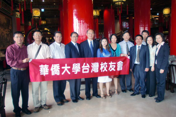 8 日下午,华侨大学第五届董事会副董事长赵阳、华侨大学校长丘进在台访问期间看望了我校部分在台校友。 丘进校长代表华侨大学全体师生感谢台湾校友们长期以来对学校建设发展的支持与贡献,并向台湾校友介绍了学校建设中取得的成绩,阐述了学校的战略规划和发展远景。丘进校长说,华侨大学台湾校友是推动海峡两岸交流的重要力量,是学校不断进步发展的宝贵财富。他勉励校友勤奋工作,多向台湾各界宣传和介绍华侨大学,积极发挥桥梁作用,促进华侨大学与台湾高校的交流和合作。 台湾校友在获悉母校近年来的发展情况后,欣喜之情溢于言表。他们纷纷发表感言,感谢母校的栽培,祝愿华侨大学的明天会更美好,并对学校的发展提出了许多有益建议。  赵阳(左五)、丘进(左四)与我校台湾校友合影