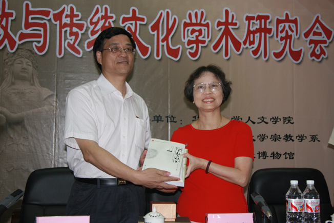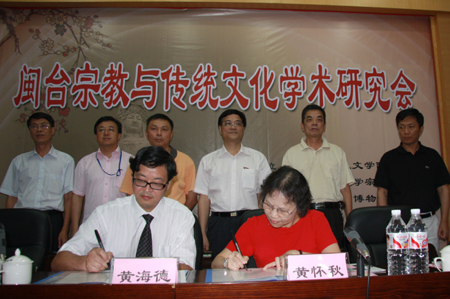 莅校访问的台湾辅仁大学宗教学系学者今日上午与我校及中国闽台缘博物馆、泉州市博物馆、泉州市文化保护研究中心的专家们汇聚我校陈嘉庚纪念堂二楼会议室,共同研讨“闽台宗教与传统文化”。 副校长张禹东到会祝贺。他欢迎来自台湾辅仁大学的专家学者,向来宾介绍学校办学情况。他说,华大与台湾高校交流互动开始很早,并与辅仁大学等台湾高校保持着密切关系。他称,当前两岸关系正进入新的发展阶段,为交流合作提供了很好的发展机会,希望两校以宗教学科的交流为起点,将交流合作进一步拓展到两校其他学科;并希望两校探索形成一种研究生交换、教师互访、学术研讨的机制。 会上,我校宗教文化研究所与辅仁大学宗教学系签订学术交流与合作协议。根据协议,双方将协商定期召开有关宗教文化的学术会议;在适当时候互相邀请宗教研究学者进行学术访问;条件成熟时开展有关宗教学术的合作研究课题;协商互派宗教学专业研究生进行短期学习等。 辅仁大学宗教学系主任黄怀秋教授还受聘我校客座教授,张禹东副校长为其颁发聘书。 黄怀秋在致辞中说,华大的热情接待让她很感动,她感谢学校的聘请,表示相信两校之间的合作一定会很好地开展。 会与专家学者们从各自的学术专长出发,就闽台两地的儒、释、道等宗教及民间宗教,民间信仰、闽台民俗等展开研讨。学者们认为,闽台两地民间信仰血脉相通,具有很多共同的文化特质、相同文化传承和操作模式;闽台两地的宗教文化交流可以更加密切,并期望以辅仁大学和华大的系所合作为起点,建立更多的闽台文化交流网络。 参加研讨的有中国闽台缘博物馆馆长杨彦杰,泉州市文化保护研究中心研究员陈鹏鹏,泉州市博物馆馆长陈建中、副馆长林德民,辅仁大学宗教学系黄怀秋、郑志明、庄庆信、庄宏谊、郑素春、郑印君、刘嘉琪,我校蔡振翔、黄海德、王四达、刘以榕、范正义及我校人文学院、宗教文化研究所、华侨华人研究所、中国哲学研究所的师生们。 研讨会由我校人文学院院长曾亚雄主持。校外事处、研究生处领导出席。  张禹东致辞