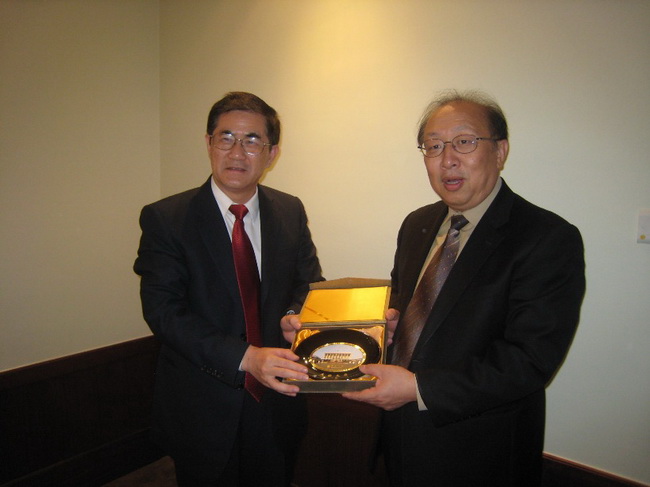 与澳门公开大学颜泽贤校长(左)交换纪念品