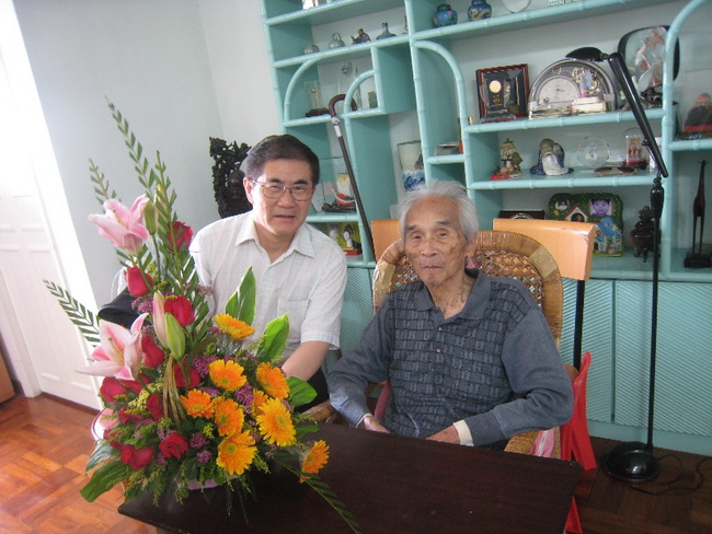 看望梁披云荣誉董事(右)