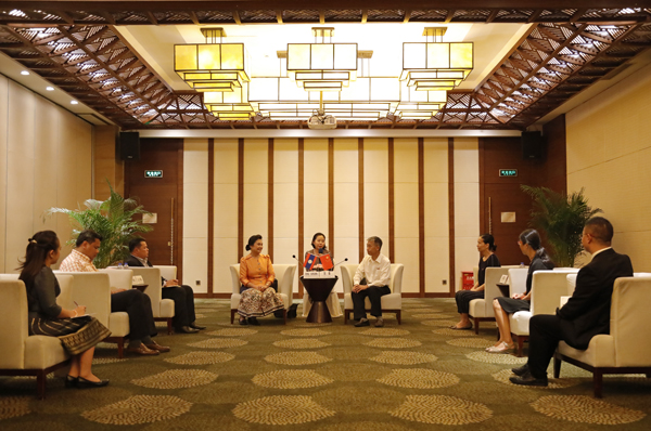 老挝总理府办公厅组织与人文司司长孔山·赛亚山、秘书司副司长维绞·布帕万,华侨大学华文教育处、华文学院相关负责人等参加会见。