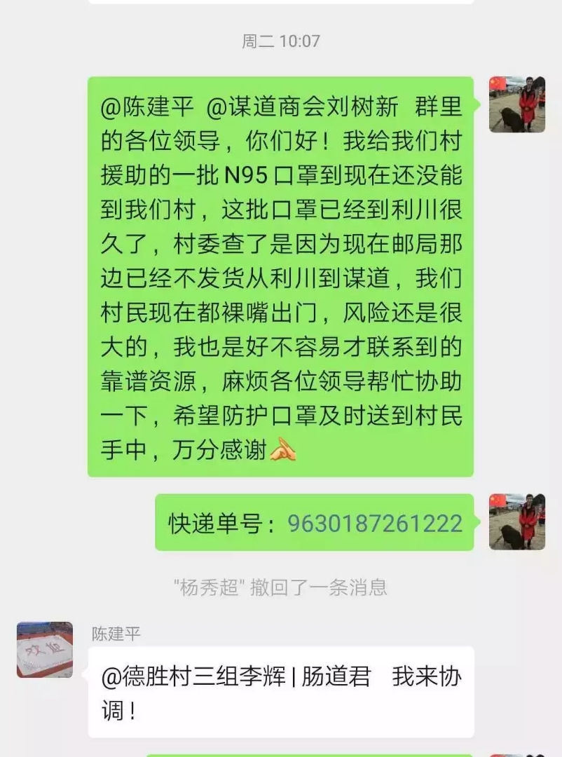 “因为从武汉封城到湖北封省,所有的防护物资都只能送到武汉,快递物流停运,不停运的也囤积发不出,最开始说顺丰可以,天天催促得到的回复是‘安排了’,可到初八的时候货还没有寄出,因为根本发不完。想到退货,但是退了货,就更难找到货了,只能多次去协调能不能发其他物流,最后说邮政EMS可以,EMS发出后每天多次查看物流信息,眼看着口罩到了利川,但是过去四五天了还是在利川往谋道的运送过程中,多次打电话询问,得到的回复是只能去利川取货,送不到利川以下的乡镇。当时每个村都已封路,自行车都不能通行。就在一筹莫展之际,想到通过谋道镇的一个乡贤交流群联系到当地镇干部,这才在书记镇长的帮助下几经周折终于将口罩送到了谋道镇。”