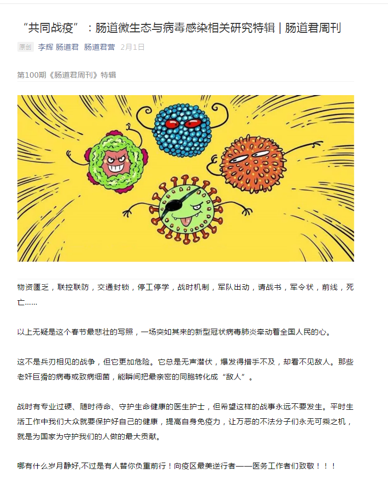 除了物资援助,在科学知识防控上李辉也积极通过微信公众号进行普及推广,连续原创多篇关于病毒防范的健康科普知识。
