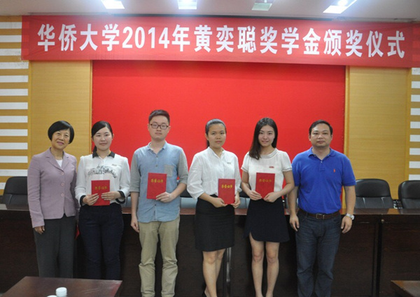 黄奕聪慈善基金会秘书长苏蔷华和我校学生处相关负责人为获奖学生颁奖。苏蔷华表示,基金会支持公益事业是华人企业心系中华的表现,也希望能借此鼓励更多的青年领袖与人才,带动更多的人投身到公益活动中去。