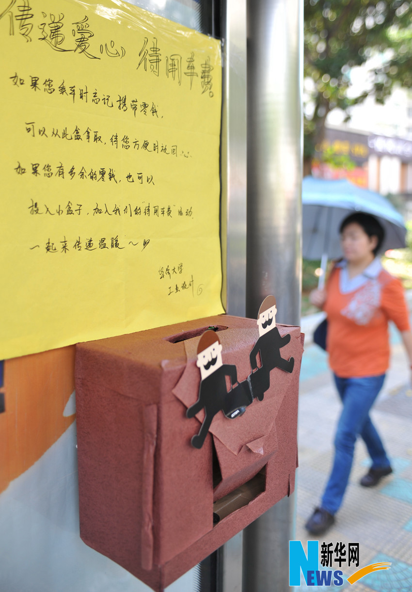 近日,由华侨大学2014级工业设计系学生发起的“爱心零钱盒”活动亮相厦门部分公交车站,引起广泛关注。挂在公交车站的“爱心零钱盒”无人看管,市民如果乘车时忘带零钱,可以从此盒取用;如果有多余零钱,也可投进盒子里,传递爱心。不少市民为“爱心零钱盒”点赞,并加入到这场文明自觉的爱心传递行动中。新华社记者林善传摄